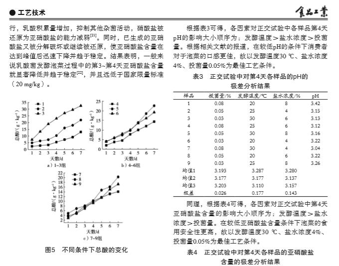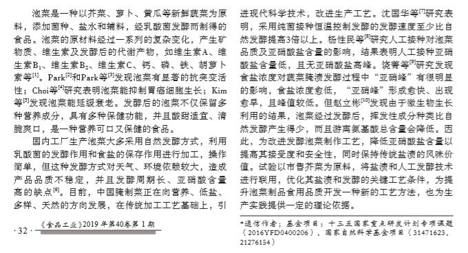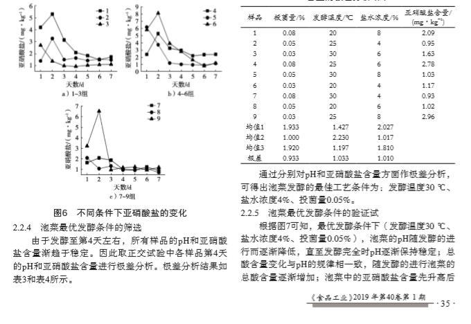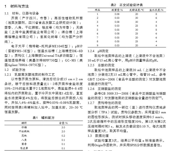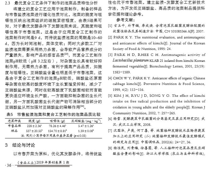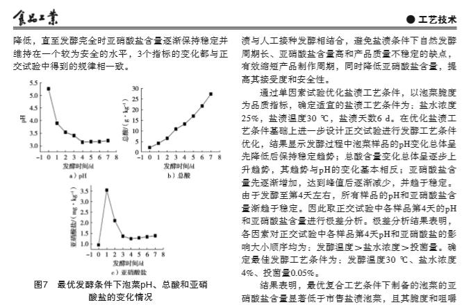 摘要:為降低泡菜亞(ya)硝酸鹽含(han)量, 同時保(bao)持傳統(tǒng)(tong)鹽漬(zi)的風(feng)味價值, 以(yi)市售芥菜(cai)為原料, 將傳(chuan)統(tǒng)鹽漬與(yu)人工接種發(fā)(fa) 酵工藝相結(jié)(jie)合, 探討先(xian)高鹽鹽(yan)漬處(chu)理后再低鹽(yan)發(fā)酵的復(fu)合新工藝對(dui)泡菜發(fā)酵過程(cheng)中組分和品(pin)質(zhì)動態(tài)的影響(xiang)。結(jié)果 表(biao)明, 泡菜鹽漬工(gong)藝適(shi)宜條件(jian)為: 鹽(yan)濃度25%, 鹽漬(zi)溫度(du)30 ℃, 鹽漬天數(shù)(shu)6 d。在優(yōu)化鹽漬工(gong)藝基礎(chǔ)(chu)上進行后發(fā)(fa)酵的 正(zheng)交試(shi)驗, 結(jié)果(guo)顯示隨著發(fā)酵(jiao)天數(shù)增加(jia), 泡菜(cai)的pH先(xian)下降后趨于穩(wěn)(wen)定, 總酸的變(bian)化趨勢和(he)pH相反, 亞硝酸(suan)鹽含量增加(jia)到出現(xiàn)(xian)“亞硝峰(feng)”后下降(jiang)后趨于穩(wěn)定(ding), 得出*后發(fā)(fa)酵工(gong)藝條(tiao)件是: 鹽(yan)水濃(nong)度4%、投菌量0.05%、發(fā)酵(jiao)溫度30 ℃。在此工(gong)藝下制作的泡(pao)菜亞硝酸鹽含(han)量 (1.39 mg/kg) 遠(yuan)低于(yu)市售泡菜產(chǎn)(chan)品 (5.47 mg/kg), 且其(qi)脆度和(he)咀嚼性(xing)也優(yōu)于(yu)市售泡菜(cai)。研究結(jié)果(guo)為開發(fā)高品(pin)質(zhì)泡(pao)菜制品建(jian)立了一種新的(de)工藝技術(shù)方法(fa), 也為實踐生產(chǎn)(chan)提供理論(lun)參考。?