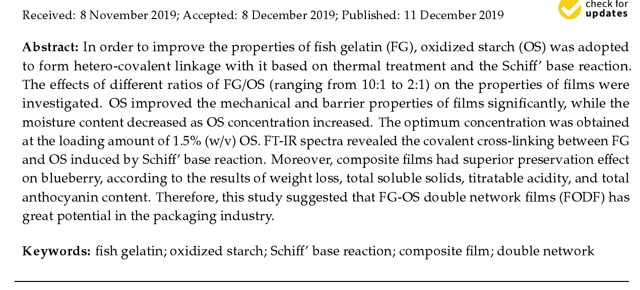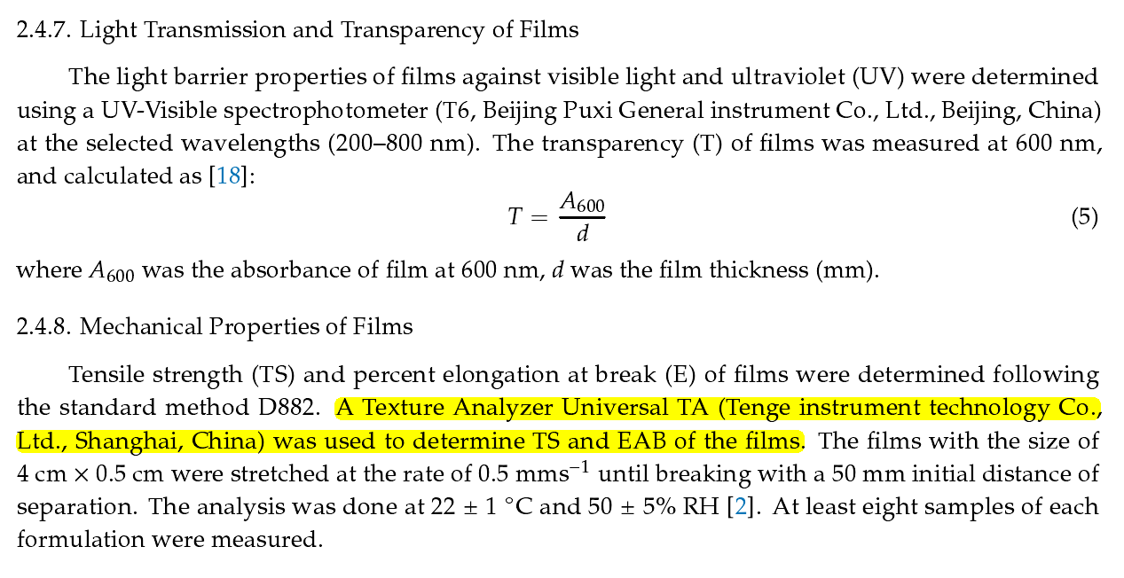Technical articles? 2019年12月,山東大學(xué)(xue)海洋學(xué)(xue)院研究人(ren)員在(zai)期刊《Polymers》在線發(fā)(fa)表了題為“Development and Properties of Fish Gelatin/Oxidized Starch Double Network Film Catalyzed by Thermal Treatment and Schiff’Base Reaction"的研究論(lun)文。在本論文中,研(yan)究人(ren)員利(li)用上海騰拔Universal TA研(yan)究型質(zhì)(zhi)構(gòu)儀用(yong)于測(cè)(ce)定魚(yú)明膠/氧化(hua)淀粉膜的(de)拉伸強(qiáng)(qiang)度和斷裂伸長(zhǎng)(zhang)率。? ? ? ?
