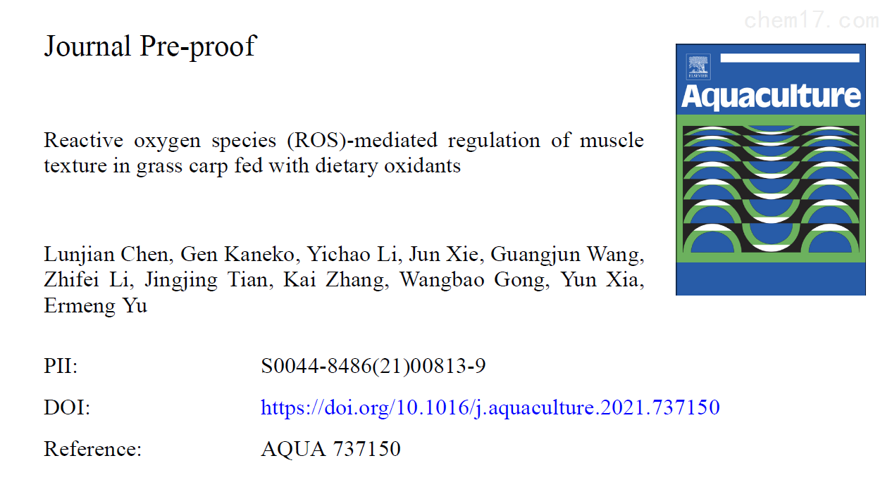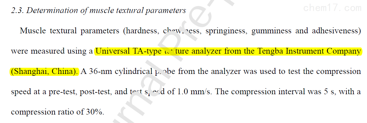 ? 近日,中國水(shui)產(chǎn)科(ke)學(xué)研究(jiu)院珠(zhu)江水產(chǎn)研究所(suo)在農(nóng)林科(ke)學(xué)領(lǐng)域(yu)TOP期刊《Aquaculture》(IF=4.242)在線發(fā)表了(le)題為“Reactive oxygen species (ROS)-mediated regulation of muscle texture in grass carp fed with dietary oxidants"的(de)研究(jiu)論文(wen),在該研究論文(wen)中,研(yan)究人員(yuan)利用(yong)上海騰拔(ba)Universal TA研究型(xing)質(zhì)構(gòu)儀測定(ding)草魚的(de)硬度、彈(dan)性、咀嚼性和(he)粘附性等指(zhi)標(biāo)。這是上海(hai)騰拔質(zhì)構(gòu)儀助(zhu)力珠江水產(chǎn)(chan)研究所在(zai)國際期(qi)刊《Aquaculture》、《Food Chemistry》和《Foods》發(fā)(fa)表論文(wen)后,再(zai)次助力珠江(jiang)水產(chǎn)研究所(suo)在國際(ji)期刊《Aquaculture》發(fā)表論文。