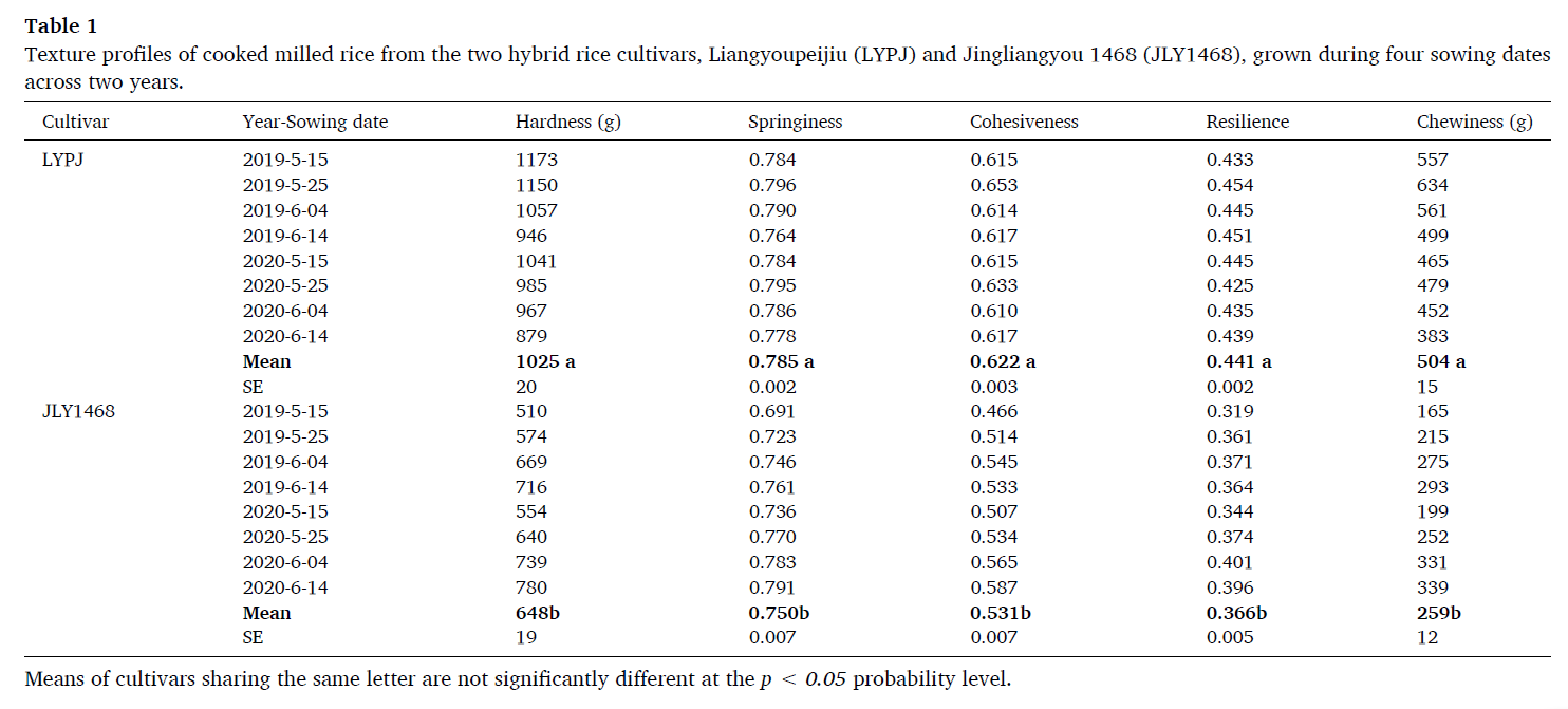 Technical articles近期(qi),湖南農(nóng)業(yè)大學(xué)(xue)作物生理與(yu)分子生物(wu)學(xué)教育(yu)部重點(diǎn)實(shí)(shi)驗(yàn)室研(yan)究人員(yuan)在國際食(shi)品期刊《Food Chemistry: X》發(fā)表了(le)題為“Texture and digestion properties of hybrid rice: A comparison between two c*rs released 18 years apart"的研究(jiu)論文。在該(gai)論文中(zhong),研究人員利用(yong)上海(hai)騰拔Rapid TA+質(zhì)構(gòu)(gou)儀測(cè)定雜交水(shui)稻蒸煮米的(de)硬度、彈性(xing)、回復(fù)性(xing)、內(nèi)聚性和咀(ju)嚼性等(deng)指標(biāo)(biao)。