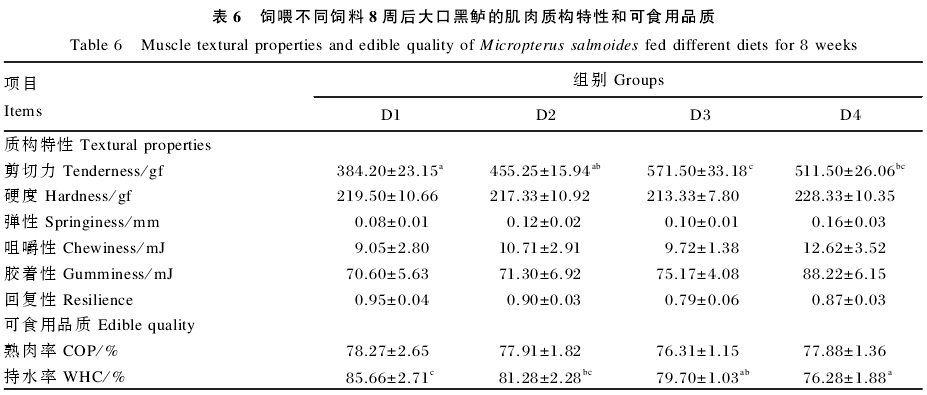 各組大口黑鱸(lu)的肌肉質(zhì)構(gòu)特(te)性和可食(shi)用品質(zhì)見(jiàn)表(biao) 6。 不同(tong)飼料(liao)對(duì)大口黑(hei)鱸肌肉硬度(du)、彈性、咀嚼(jue)性、膠著性、回復(fù)(fu)性和熟(shu)肉率的(de)影響(xiang)較少,各組間無(wú)(wu)顯著差異(yi)(P>0.05)。 相比于(yu)D3 和 D4 組,D1、D2 組肌肉剪(jian)切力顯著降低(di)(P<0.05),肌肉持水率(lv)顯著升高(P<0.05)。 上述(shu)結(jié)果說(shuō)明含(han)CProⅠ和CProⅡ飼料(liao)有利于提高大(da)口黑鱸(lu)肌肉的嫩度。