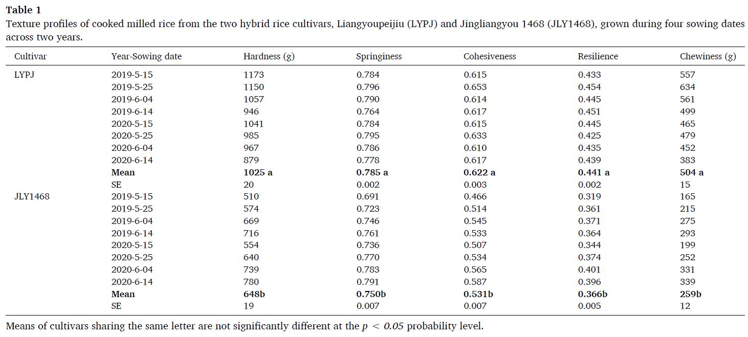 在該論文中(zhong),研究人員進(jìn)(jin)行野外試驗來(lai)對比兩個(ge)雜交水(shui)稻品種--個(ge)是最近發(fā)(fa)布的高品質(zhì)(zhi)品種(Jingliangyou 1468, JLY1468)和一個(ge)相對更(geng)老的品種(zhong)(Liangyoupeijiu, LYPJ)。質(zhì)構(gòu)儀(yi)測試結(jié)果表明(ming)JLY1468中熟精米的(de)硬度、彈性、內(nèi)聚(ju)性、回復(fù)(fu)性和咀嚼(jue)性都低(di)于LYPJ,這是(shi)由于JLY1468精米(mi)粉更低的直(zhi)連淀粉(fen)含量和改變(bian)的糊化(hua)特性(xing)的影(ying)響。相比LYPJ,JLY1468活性消(xiao)化持續(xù)(xu)時間縮短26%,來(lai)自淀粉消(xiao)化的葡萄糖產(chǎn)(chan)生率(lv)快33%。該研究(jiu)強調(diào)我(wo)們應(yīng)該關(guān)注與(yu)培育具有軟質(zhì)(zhi)地的高品(pin)質(zhì)雜交(jiao)水稻品種相關(guān)(guan)的潛在(zai)健康風(fēng)險。