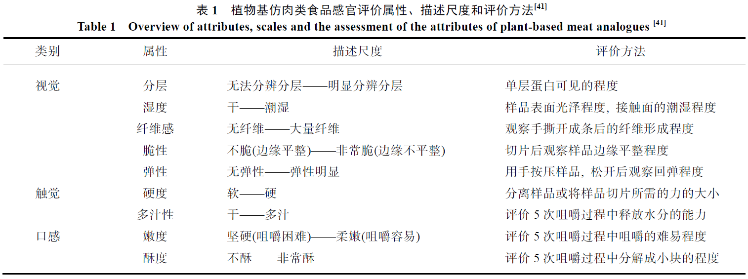 在感官評價(jia)中, 通???ke)以通過(guo)描述性分析對(dui)植物基仿肉類(lei)食品(pin)的外觀與口(kou)感進(jìn)行評價(jia), 表1 給出(chu)了一(yi)些常見的(de)評價(jia)指標(biāo), 參考Grahl等(deng)的方法(fa)略有修改。在(zai)感官評(ping)價小組的(de)培訓(xùn)過程(cheng)中, 需要(yao)制作有關(guān)(guan)于描述尺(chi)度的樣(yang)本,以定(ding)義各描(miao)述尺(chi)度下確切的(de)感官概(gai)念。