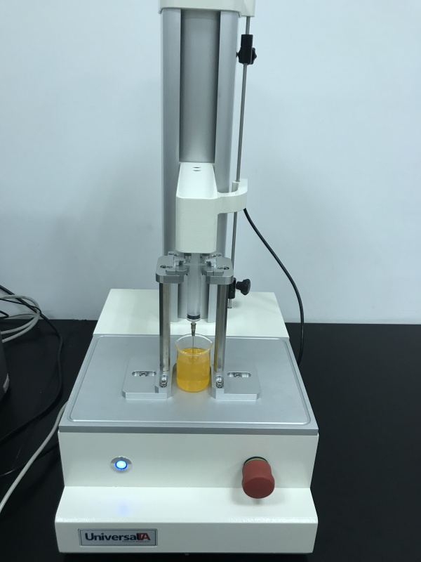 ? ? ? 將注射器固(gu)定于注射器(qi)支撐裝(zhuang)置上,通過(guo)與力量感應(yīng)元(yuan)連接的上部固(gu)定裝(zhuang)置對注射器活(huo)塞施加(jia)壓力,推動注射(she)藥液通(tong)過注射器(qi)和針(zhen)頭,直到將溶液(ye)推出(chu)針頭,計(ji)算溶液(ye)流出針頭的(de)平均力作(zuo)為溶液(ye)的通(tong)針性測試指(zhi)標。