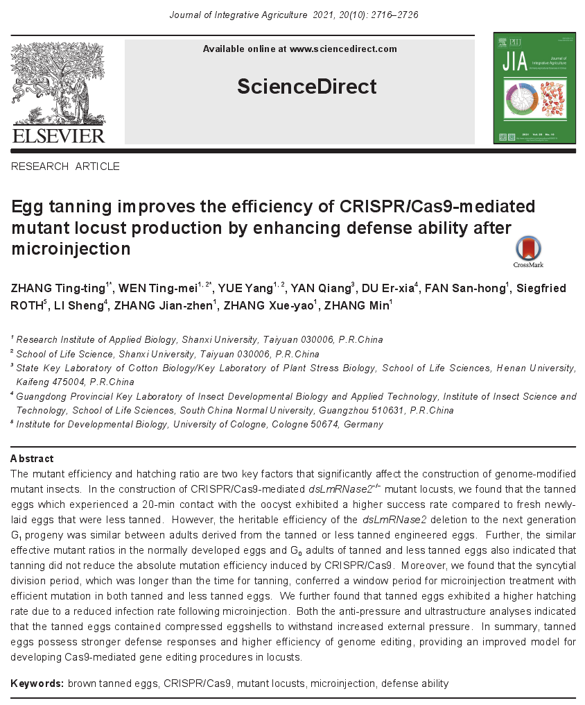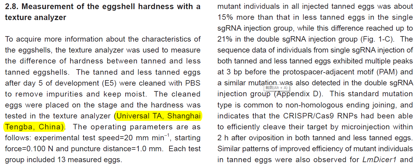 Technical articles近期,山西(xi)大學應用生(sheng)物學研究所研(yan)究人員在農林(lin)科學領(ling)域國際期刊(kan)《Journal of Integrative Agriculture 》(IF=2.848)發(fā)表了題為"Egg tanning improves the efficiency of CRISPR/Cas9-mediated mutant locust production by enhancing defense ability after microinjection"的(de)研究(jiu)論文。在該研(yan)究論文(wen)中,研究(jiu)人員利用上(shang)海騰拔Universal TA研究(jiu)型質構儀測定(ding)蛋殼的硬(ying)度。
