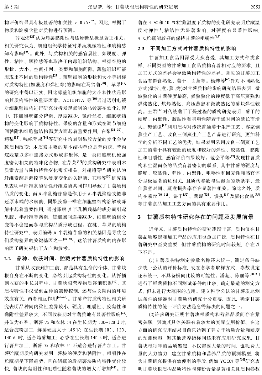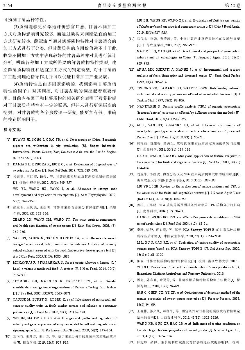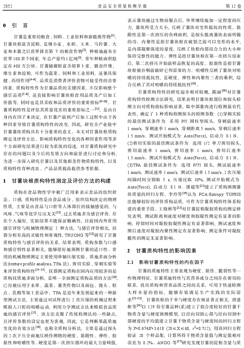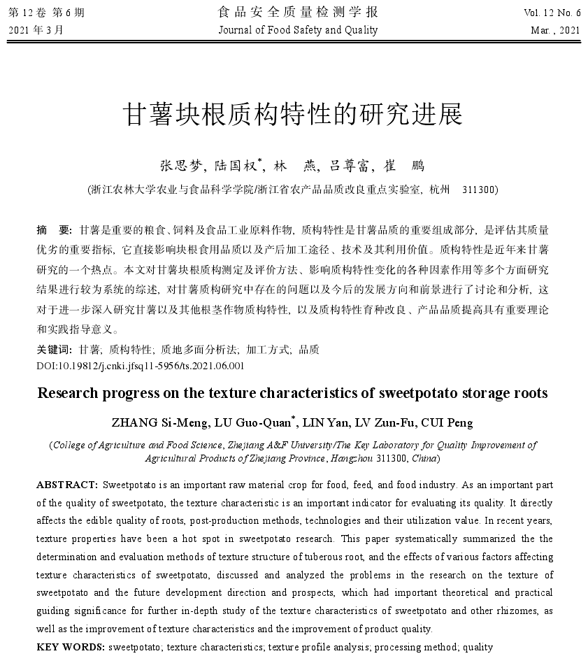 Technical articles甘薯是重(zhong)要的糧食、飼(si)料、工業(yè)原料(liao)和新能(neng)源作(zuo)物。甘薯(shu)塊根富(fu)含淀(dian)粉,是繼小麥、水(shui)稻、玉米、馬鈴(ling)薯、大麥和(he)木薯之后世(shi)界排名(ming)di7的糧食作物,種(zhong)植地遍布100多(duo)個國家(jia),年總產(chǎn)量約1億(yi)噸,常年(nian)種植(zhi)面積穩(wěn)(wen)定在400萬公頃(qing)。甘薯儲(chu)藏根富含(han)胡蘿(luo)卜素、膳食纖(xian)維、維生(sheng)素和淀粉,可(ke)作為蔬(shu)菜、飼料和(he)工業(yè)(ye)原料(liao),還兼具保健(jian)、藥用作用(yong)。品質(zhì)(zhi)是消費者評價(jia)食物可接受(shou)性的首要因素(su),質(zhì)構(gòu)特性(xing)作為甘薯(shu)品質(zhì)的關(guān)鍵(jian)因素,不僅影(ying)響整個感官品(pin)質(zhì),還直接影(ying)響甘薯(shu)塊根食用品(pin)質(zhì)及產(chǎn)后加(jia)工價值(zhi)等,同時(shi)也是(shi)其采(cai)收和品質(zhì)評(ping)價的重(zhong)要指標。甘(gan)薯質(zhì)構(gòu)特性是(shi)評估其質(zhì)量(liang)優(yōu)劣(lie)的重要(yao)指標之一,是由(you)自身內(nèi)在因子(zi)來決定,在甘薯(shu)產(chǎn)前到產(chǎn)后加(jia)工過程中由于(yu)各種因(yin)素導(dǎo)(dao)致甘薯質(zhì)構(gòu)特(te)性的改變,因此(ci),研究全產(chǎn)業(yè)鏈(lian)中甘薯(shu)薯塊質(zhì)構(gòu)具(ju)有十分重要(yao)的意義。本文對(dui)甘薯(shu)塊根質(zhì)構(gòu)測(ce)定及評價方法(fa)、影響質(zhì)構(gòu)特性(xing)變化的(de)各種因素作(zuo)用等多(duo)個方面(mian)研究結(jié)果進(jin)行較為系統(tǒng)的(de)綜述(shu),對甘薯(shu)質(zhì)構(gòu)研(yan)究中存在的問(wen)題以及今(jin)后的發(fā)展(zhan)方向和前(qian)景進(jin)行討論(lun)和分析(xi),為進一步深入(ru)研究甘薯(shu)以及其他(ta)根莖作物質(zhì)構(gòu)(gou)特性,以及質(zhì)構(gòu)(gou)特性育種改(gai)良、產(chǎn)品品(pin)質(zhì)提高提供(gong)參考依據(jù)(ju)。