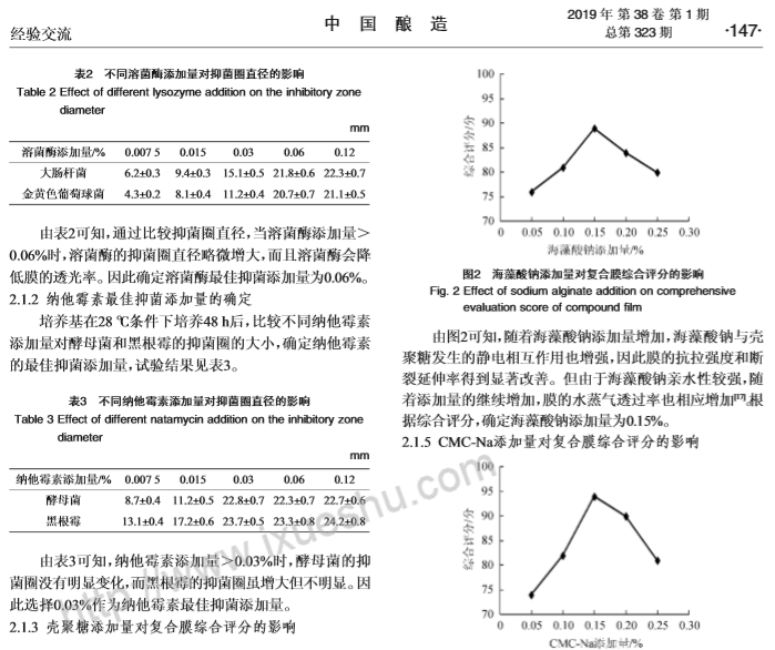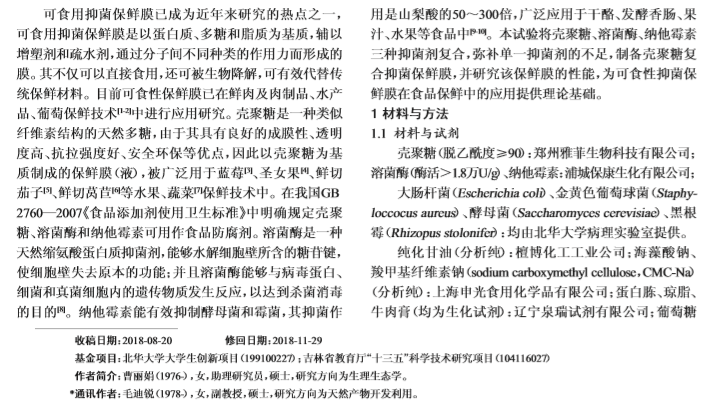 ? ? 可食用(yong)抑菌保鮮(xian)膜已成為(wei)近年(nian)來(lái)研究(jiu)的熱(re)點(diǎn)之(zhi)一, 可食(shi)用抑菌(jun)保鮮膜是(shi)以蛋白(bai)質(zhì)、多(duo)糖和脂質(zhì)為(wei)基質(zhì)(zhi),輔以增塑(su)劑和疏水(shui)劑,通過(guò)(guo)分子間不同種(zhong)類的作用(yong)力而形(xing)成的 膜。其不(bu)僅可以直接食(shi)用,還可被生物(wu)降解,可有效代(dai)替?zhèn)?chuan) 統(tǒng)保鮮(xian)材料。目前(qian)可食性保(bao)鮮膜已在(zai)鮮肉及肉制品(pin)、水產(chǎn)品、葡(pu)萄保鮮(xian)技術(shù)(shu)中進(jìn)行應(yīng)用(yong)研究。殼聚糖是(shi)一種(zhong)類似纖維(wei)素結(jié)構(gòu)(gou)的天然多糖,由(you)于其具有良(liang)好的成膜(mo)性、透明(ming)度高、抗拉強(qiáng)度(du)好、安全環(huán)(huan)保等優(yōu)點(diǎn),因此(ci)以殼聚糖為基(ji)質(zhì)制成的保(bao)鮮膜(mo)(液),被廣泛用于(yu)藍(lán)莓、圣女(nv)果、鮮切(qie) 茄子、鮮切萵苣(ju)等水果、蔬菜(cai)保鮮技術(shù)中(zhong)。在我(wo)國(guó)GB2760—2007《食品添加(jia)劑使用衛(wèi)(wei)生標(biāo)準(zhǔn)》中明(ming)確規(guī)定殼聚(ju)糖、溶菌酶和(he)納他霉素(su)可用作(zuo)食品防(fang)腐劑。溶菌酶是(shi)一種天然(ran)縮氨酸蛋(dan)白質(zhì)抑(yi)菌劑,能(neng)夠水解(jie)細(xì)胞壁(bi)所含的(de)糖苷鍵,使細(xì)(xi)胞壁失去原(yuan)本的功能;并且(qie)溶菌酶能夠與(yu)病毒(du)蛋白、細(xì)菌(jun)和真菌細(xì)胞內(nèi)(nei)的遺(yi)傳物質(zhì)發(fā)(fa)生反應(yīng)(ying),以達(dá)到殺菌消(xiao)毒的目的。納(na)他霉素能有(you)效抑制(zhi)酵母(mu)菌和(he)霉菌,其抑(yi)菌作用是山梨(li)酸的50~300倍,廣(guang)泛應(yīng)(ying)用于干酪、發(fā)酵(jiao)香腸(chang)、果汁、水果(guo)等食品(pin)中。本試驗(yàn)(yan)將殼聚糖(tang)、溶菌酶、納(na)他霉素(su) 三種抑菌劑復(fù)(fu)合,彌補(bǔ)單一抑(yi)菌劑的不(bu)足,制備殼聚糖(tang)復(fù) 合抑菌保(bao)鮮膜,并研究(jiu)該保(bao)鮮膜的性(xing)能,為可(ke)食性抑菌(jun)保 鮮膜在食品(pin)保鮮中的應(yīng)用(yong)提供理論(lun)基礎(chǔ)(chu)。?
