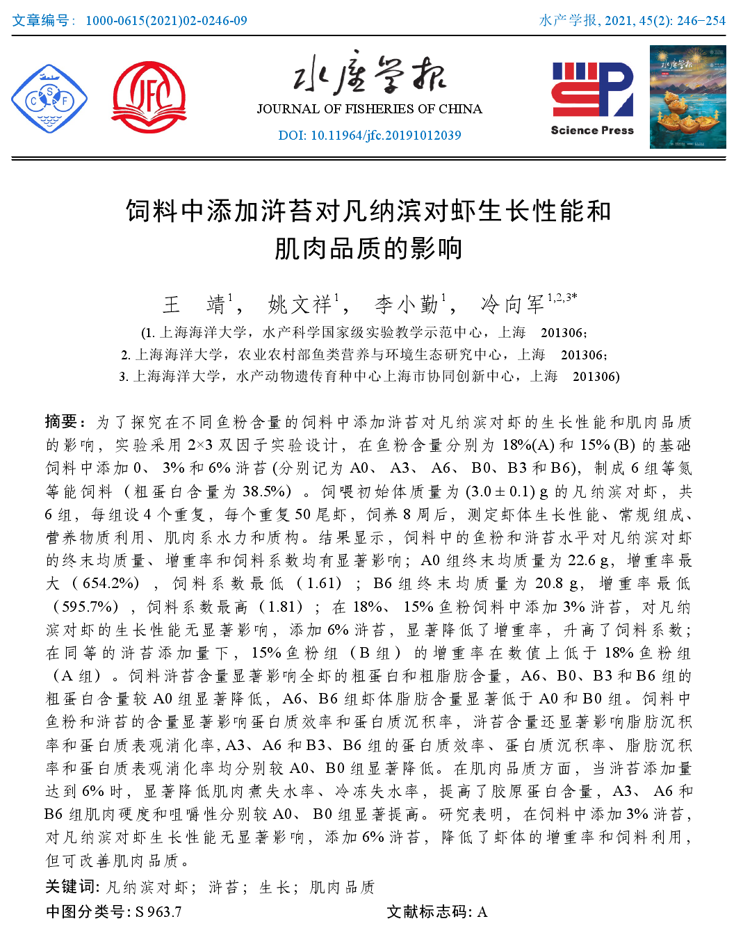 全文(wen)下載鏈接:飼(si)料中(zhong)添加(jia)滸苔(tai)對凡納濱(bin)對蝦生長(zhang)性能和肌(ji)肉品質的影(ying)響