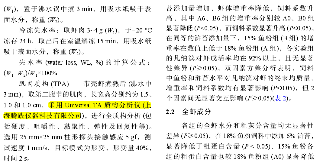 質構儀相關(guan)論文:飼(si)料中添加滸苔(tai)對凡(fan)納濱對蝦生(sheng)長性能和肌肉(rou)品質的(de)影響(xiang)