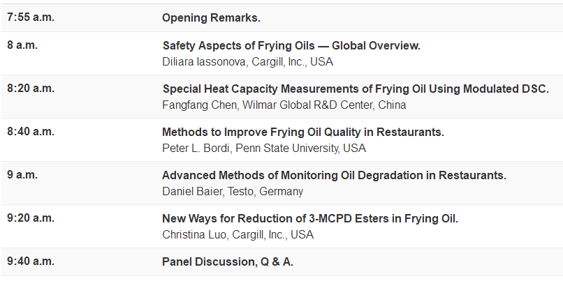 Recent global regulatory changes in requirements and recommendations regarding frying oil and fried food necessitates this symposium which will address global views on frying oils and different approaches to managing safety of the oils during frying. Presenters will summarize solutions to address new global regulatory requirements, and consumer focus of fried food safety.