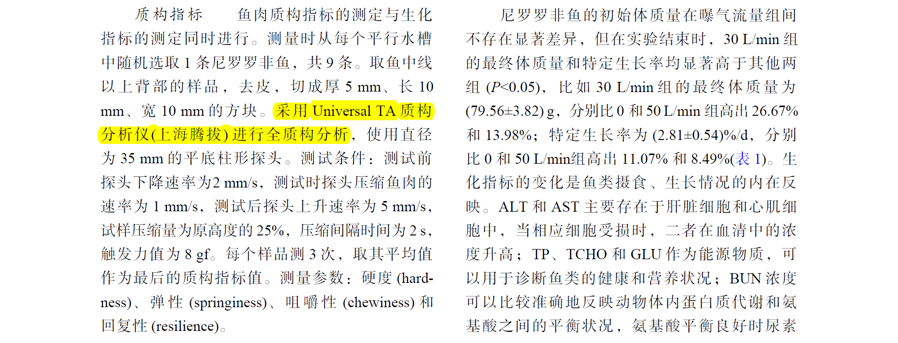 ? ? 2020年,國(guo)內(nèi)期(qi)刊《水產(chǎn)(chan)學(xué)報(bào)》在線發(fā)表(biao)了華南理工(gong)大學(xué)(xue)土木與交通學(xué)(xue)院、中(zhong)國水產(chǎn)科學(xué)(xue)研究(jiu)院珠江水產(chǎn)(chan)研究所等研究(jiu)人員題為(wei)"室內(nèi)(nei)循環(huán)養(yǎng)殖系(xi)統(tǒng)中曝氣(qi)流量對尼(ni)羅羅(luo)非魚生長的(de)影響"的(de)研究(jiu)論文(wen)。在該(gai)論文中,研究(jiu)人員用上海騰(teng)拔儀(yi)器科技有(you)限公司(si)的Universal TA國產(chǎn)質(zhì)構(gòu)(gou)儀測定羅非(fei)魚肉的硬度、彈(dan)性、咀嚼性(xing)和回(hui)復(fù)性等質(zhì)構(gòu)(gou)指標(biāo)。