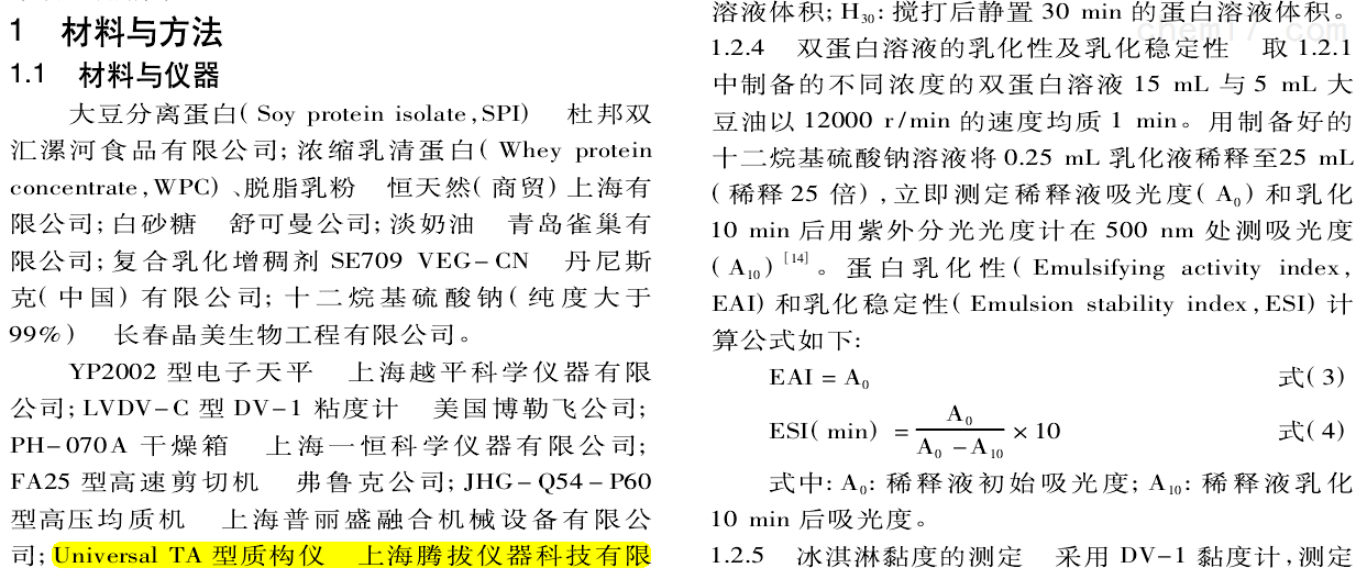 Technical articles2020年,國內期刊(kan)《食品(pin)工業(yè)科(ke)技》刊登了農(nong)業(yè)農村部(bu)食物與營養(yǎng)(yang)發(fā)展研究所(suo)研究(jiu)人員(yuan)題為“雙蛋(dan)白對(dui)冰淇淋品質(zhi)的影響"的研(yan)究論文。在該(gai)論文(wen)中,研究人員利(li)用上海騰拔(ba)Universal TA研究型質(zhi)構儀來測(ce)定冰淇淋的(de)硬度(du)。
