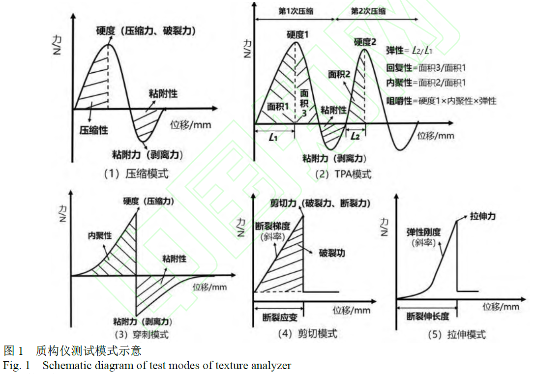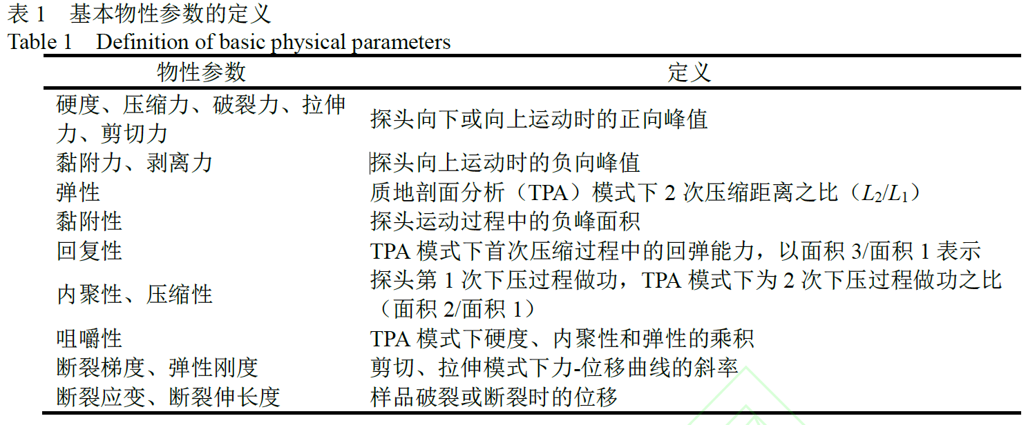 ?質(zhì)構(gòu)儀是客觀(guan)評價(jia)樣品(pin)物性特征(zheng)*的一種手段(duan),可通過(guo)統(tǒng)一的測試(shi)方法,對樣品(pin)物性特(te)征作出數(shù)據(jù)(ju)化的準確描(miao)述,見表1。質(zhì)構(gòu)儀(yi)主要由主機、探(tan)頭和附件(jian)等硬件設備(bei)以及軟件組(zu)成。主機上(shang)有一個可(ke)以上下(xia)滑動的機(ji)械臂,末端通過(guo)力學傳(chuan)感器與探(tan)頭相(xiang)連。實驗時,機(ji)械臂根據(jù)設定(ding)的速度上下(xia)移動,探頭(tou)會在接觸樣(yang)品時受到(dao)一個作用力(li),力學(xue)傳感器實時(shi)傳輸數(shù)(shu)據(jù),由(you)軟件(jian)記錄力-位移(yi)、力-時間或位移(yi)-時間(jian)曲線圖,檢(jian)測結(jié)果具(ju)有較高的(de)靈敏(min)度與客(ke)觀性,見圖1。