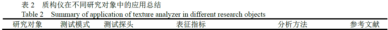 ?根據(jù)樣品的自(zi)身特性,質(zhì)構(gòu)(gou)儀有多種(zhong)探頭(圓(yuan)盤、圓柱、單刀探(tan)頭等(deng))和多(duo)種分(fen)析模式(shi)(壓縮(suo)、穿刺、剪切、拉伸(shen)模式等)可供選(xuan)擇,不同(tong)物性參數(shù)(shu)可結(jié)合(he)多種數(shù)據(jù)分析(xi)手段(方(fang)差分析、回(hui)歸分析和t 檢(jian)驗等)以達到研(yan)究目的(de)。其中應用(yong)廣泛的(de)是壓縮模式(shi),探頭(tou)以恒定速(su)度下(xia)降,壓(ya)縮樣(yang)品到某(mou)一設定目標(如(ru)一定的形變(bian)量、下壓(ya)距離)后(hou)立即返(fan)回,可(ke)以反映(ying)制劑的硬度(du)、黏附性、內(nèi)聚性(xing)等多(duo)種物性(xing)參數(shù)。對于物(wu)性參數(shù)的數(shù)據(jù)(ju)分析方法(fa),主要(yao)包括(kuo)統(tǒng)計檢驗(yan)與回歸分(fen)析2 種手段(duan),通過方差分(fen)析和t 檢驗(yan)可比(bi)較不同(tong)處方或(huo)不同測(ce)定方(fang)法下制劑(ji)物性參數(shù)之間(jian)的差(cha)異,用于體內(nèi)(nei)外相關(guān)性評價(jia)、不同處方之(zhi)間的質(zhì)(zhi)量評價;回(hui)歸分析可將一(yi)系列物性參數(shù)(shu)與工藝參數(shù)(shu)或質(zhì)量(liang)評價指標進(jin)行方(fang)程擬合,找(zhao)到關(guān)鍵物性(xing)參數(shù)與制(zhi)劑質(zhì)量之間的(de)定量關(guān)系及相(xiang)互影響規(guī)(gui)律。對(dui)近年來(lai)質(zhì)構(gòu)儀在(zai)制劑研究中(zhong)的應用文(wen)獻進行總結(jié),見(jian)表2。