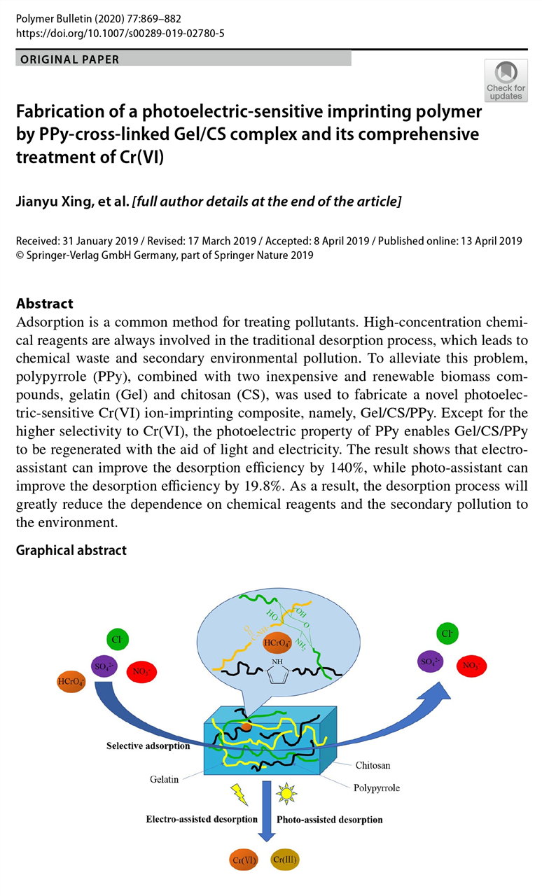 Technical articles? ? 高分子科學(xué)期(qi)刊《Polymer Bulletin》(IF=2.014)在線發(fā)表了(le)長安大學(xué)環(huán)境(jing)科學(xué)與工程(cheng)學(xué)院研究團(tuán)(tuan)隊(duì)題為“Fabrication of a photoelectric?sensitive imprinting polymer by PPy?cross?linked Gel/CS complex and its comprehensive treatment of Cr(VI)”的研(yan)究論文。