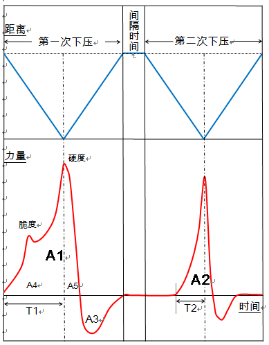 回復(fù)性?(Resilience) : 韌性(xing)是一(yi)種測量(liang)樣品(pin)如何(he)恢復(fù)變形(xing)的指針(zhen)包括了(le)速度(du)和力量兩方面(mian)。定義為*下壓時(shi),形變(bian)目標之前(qian)面積與(yu)形變(bian)目標之后(hou)的面(mian)積比(bi)值。在量測的(de)時候需要注意(yi)樣品(pin)的恢復(fù)狀況,一(yi)般而(er)言會使用一個(ge)較慢的(de)測試速(su)度已達到使(shi)樣品有足夠(gou)時間(jian)恢復(fù)的狀況。也(ye)能確(que)保這個(ge)特性(xing)的準確(que)性。在TPA圖中,回復(fù)(fu)性= A5 / A4。