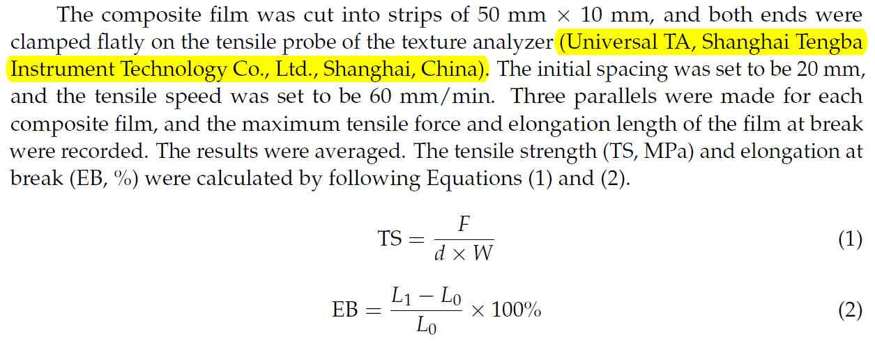 Technical articles近日,山東(dong)大學(xué)(xue)海洋學(xué)院研究(jiu)人員(yuan)在國(guó)際食品(pin)期刊《Foods》(Q1,IF=5.561)發(fā)表了(le)題為"Preparation and Properties of Blended Composite Film Manufactured Using Walnut-Peptide–Chitosan–Sodium Alginate"的研究論(lun)文。在該論文(wen)中,研究人員(yuan)使用上(shang)海騰拔(ba)Universal TA研究型質(zhì)(zhi)構(gòu)儀測(cè)定了(le)復(fù)合可食(shi)用膜的拉(la)伸強(qiáng)度和斷(duan)裂伸長(zhǎng)率(lv)。