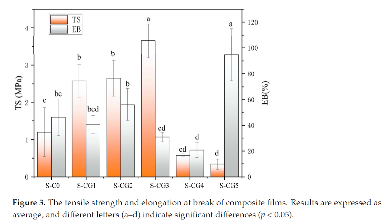 3、復(fù)合可食用(yong)膜的拉伸(shen)強(qiáng)度和斷裂(lie)伸長(zhǎng)率結(jié)(jie)果