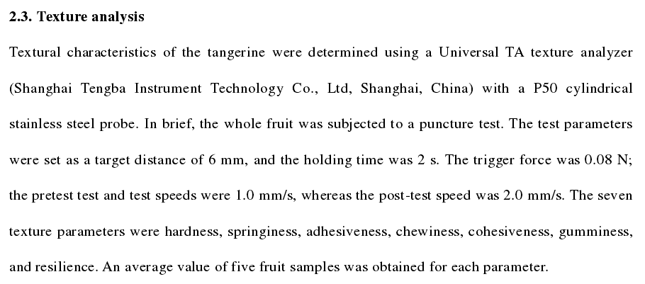 Technical articles近日,桂(gui)林理(li)工大學化學與生(sheng)物工程(cheng)學院研究(jiu)人員(yuan)在國際食(shi)品期刊《Journal of Food Processing and Preservation》(IF=2.190)發(fā)表(biao)了題為(wei)"Effects of 1-methylcyclopropene and abscisic acid ?treatments on texture properties and microstructures of postharvest tangerine (Citrus reticulata cv. Orah) "的研究論文。在該論文(wen)中,研究人(ren)員使用上(shang)海騰拔(ba)Universal TA研究型質(zhì)構(gòu)(gou)儀測定了柑橘(ju)的硬度、彈性(xing)、回復性、咀嚼性(xing)和內(nèi)聚性等(deng)指標。