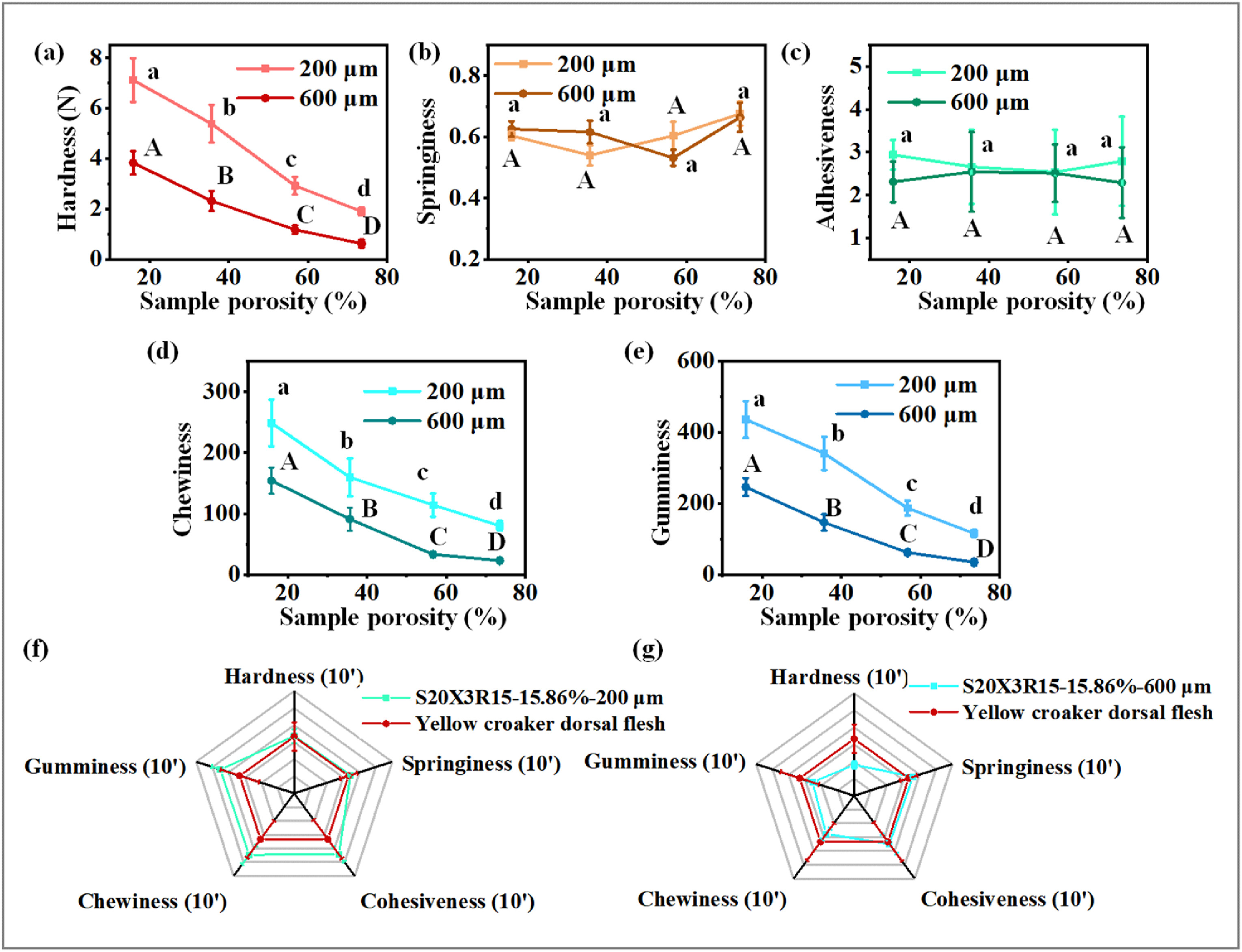 咀嚼(jue)性被定義為(wei)咀嚼固體樣(yang)品到吞(tun)咽狀態(tài)所需(xu)的能量(liang),它被定義為是(shi)硬度(du)*內(nèi)聚(ju)性*彈性。在上圖(tu)d中,打印(yin)樣品的咀(ju)嚼性隨(sui)孔隙率和(he)打印精度變化(hua)。隨著(zhe)孔隙率從(cong)15.86%變化(hua)到73.50%,對于200 μm細絲,咀嚼性從248.72 ± 38.18變(bian)化到80.26 ± 7.82;對(dui)于600 μm細(xi)絲,咀嚼性從154.28 ± 21.33 變化(hua)到23.28 ± 4.83。黃花(hua)魚真實背(bei)部肌肉的咀嚼(jue)性為(wei)185.76 ± 74.79,這與孔隙率為(wei)15.86%的200 μm細絲打印樣品咀(ju)嚼性 (248.72 ± 38.18)一致。