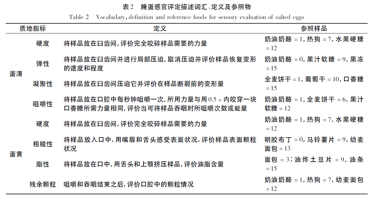 腌蛋的感官評(píng)(ping)價(jià)使用質(zhì)地(di)剖面分析法,實(shí)(shi)驗(yàn)使(shi)用0~15 標(biāo)尺(chi),0和15 分別(bie)表示非常小(xiao)和非常(chang)大。使用的描(miao)述詞匯、定義(yi)和參照物見(jiàn)表(biao)2。招募了(le)6 名食品專業(yè)(ye)的學(xué)(xue)生( 4 名(ming)女性、2 名男性) 作(zuo)為評(píng)審(shen)員,進(jìn)(jin)行6 次重(zhong)復(fù)實(shí)驗(yàn)。感(gan)官評(píng)價(jià)時(shí),蛋(dan)清切(qie)成10 mm × 10 mm × 8 mm 大小,蛋(dan)黃切(qie)成20 mm × 20 mm × 10 mm 大小。評(píng)(ping)審小(xiao)組的選拔和(he)培訓(xùn)以(yi)及整(zheng)個(gè)感官評(píng)定(ding)的過(guò)程參照(zhao)GB /T 16860-1997的具體要求(qiu)進(jìn)行。