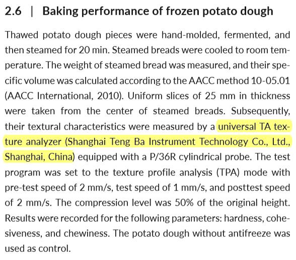 ? ? 在該研究論文(wen)中,研究人員(yuan)利用上(shang)海騰拔的(de)Universal TA研究型國(guó)產(chǎn)質(zhì)(zhi)構(gòu)儀用于測(cè)定(ding)馬鈴(ling)薯面包的硬度(du)、回復(fù)性(xing)、內(nèi)聚性和咀(ju)嚼性等(deng)指標(biāo)。