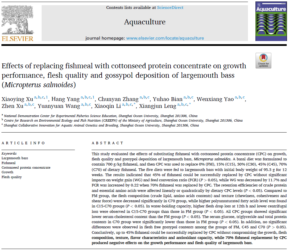 Technical articles近期,上海騰(teng)拔儀器(qi)科技有限公(gong)司Universal TA研(yan)究型(xing)質(zhì)構(gòu)儀(yi)助力上海(hai)海洋大(da)學(xué)冷向軍教授(shou)團隊(dui)分別在國際水(shui)產(chǎn)期刊《Aquaculture》(IF=4.242)和《Aquaculture?Nutrition》(IF=3.497)發(fā)(fa)表了題為"Effects of replacing fishmeal with cottonseed protein concentrate on growth performance, flesh quality and gossypol deposition of largemouth bass(Micropterus salmoides)"和"Dietary rutin promoted the growth, serum antioxidant response and flesh collagen, free amino acids contents of grass carp (Ctenopharyngodon idella)"的(de)研究論(lun)文。在這(zhe)兩篇論(lun)文中,研究人(ren)員利用上海(hai)騰拔Universal TA研究型(xing)質(zhì)構(gòu)(gou)儀分別(bie)測定大口黑鱸的硬度、彈性、咀(ju)嚼性和內(nèi)(nei)聚性以(yi)及剪切力和草(cao)魚的硬(ying)度、彈性(xing)、咀嚼性(xing)、內(nèi)聚性、粘(zhan)附性和回復(fù)(fu)性。
