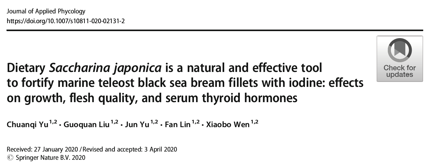 Data download? ? 2020年4月3日,食品期(qi)刊《Journal of Applied Phycology》(IF=2.635)在線發(fā)表(biao)了汕頭(tou)大學(xué)研究團(tuán)(tuan)隊(duì)題為“Dietary Saccharina japonica is a natural and effective tool to fortify marine teleost black sea bream fillets with iodine: effects on growth, flesh quality, and serum thyroid hormones”的研究(jiu)論文。