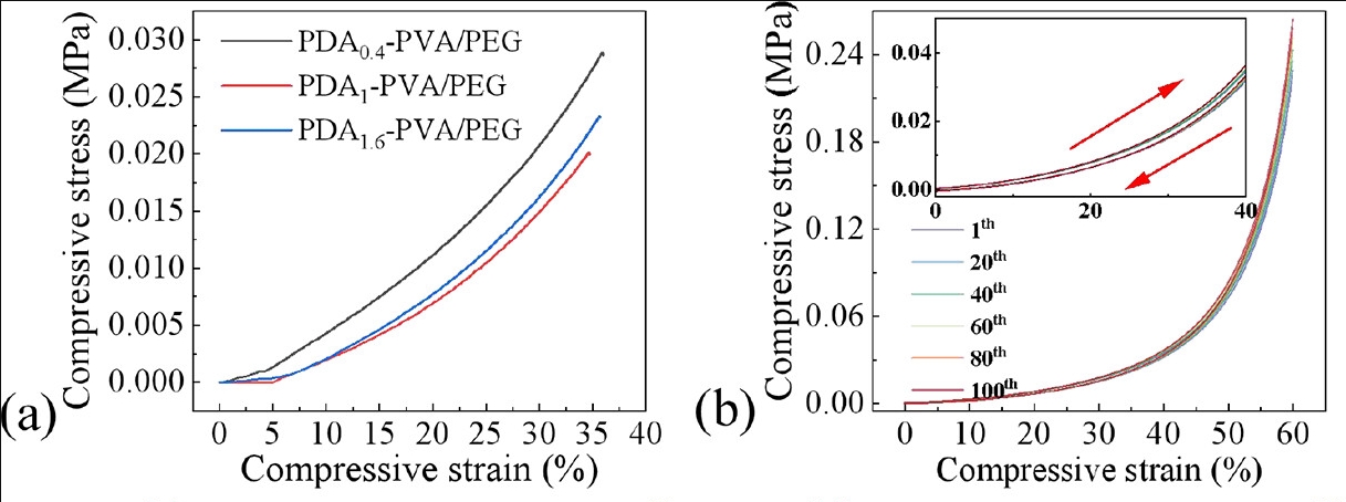 在該研究中,研(yan)究人員利用上(shang)海騰拔(ba)Universal TA質(zhì)構(gòu)(gou)儀來測(cè)定PDAX?PVA/PEG水凝膠(jiao)的力學(xué)性(xing)能。下圖(tu)a為PDAX?PVA/PEG水凝膠(jiao)的應(yīng)力(li)-應(yīng)變(bian)曲線,當(dāng)(dang)應(yīng)變達(dá)(da)到大約35%時(shí),PDA1?PVA/PEG水凝膠壓強(qiáng)最(zui)小,為(wei)0.02MPa,相比(bi),PDA0?PVA/PEG的壓強(qiáng)為0.038 MPa。這表(biao)明PDA的引(yin)入增加了(le)水凝膠(jiao)的柔(rou)性,這可能歸因(yin)于PDA引起(qi)的非共價(jià)(jia)作用(yong)。改變交聯(lián)程(cheng)度可以(yi)改變水凝膠(jiao)的彈性和在(zai)壓力下(xia)的變形能力,反(fan)過來影響其壓(ya)強(qiáng)-傳感能力。對(duì)(dui)于PDA1.6?PVA/PEG水凝膠,其壓強(qiáng)(qiang)有所上升,這說(shuo)明過量的PDA可以(yi)導(dǎo)致水凝膠(jiao)變得更堅(jiān)硬(ying)。下圖b為PDA1?PVA/PEG水凝膠的循環(huán)(huan)壓縮(suo)測(cè)試。在100次循環(huán)(huan)中,曲線表(biao)現(xiàn)出極小的(de)延滯?;瘜W(xué)(xue)和物理雙交聯(lián)(lian)使得水凝(ning)膠具有較(jiao)高的疲勞性能(neng)。