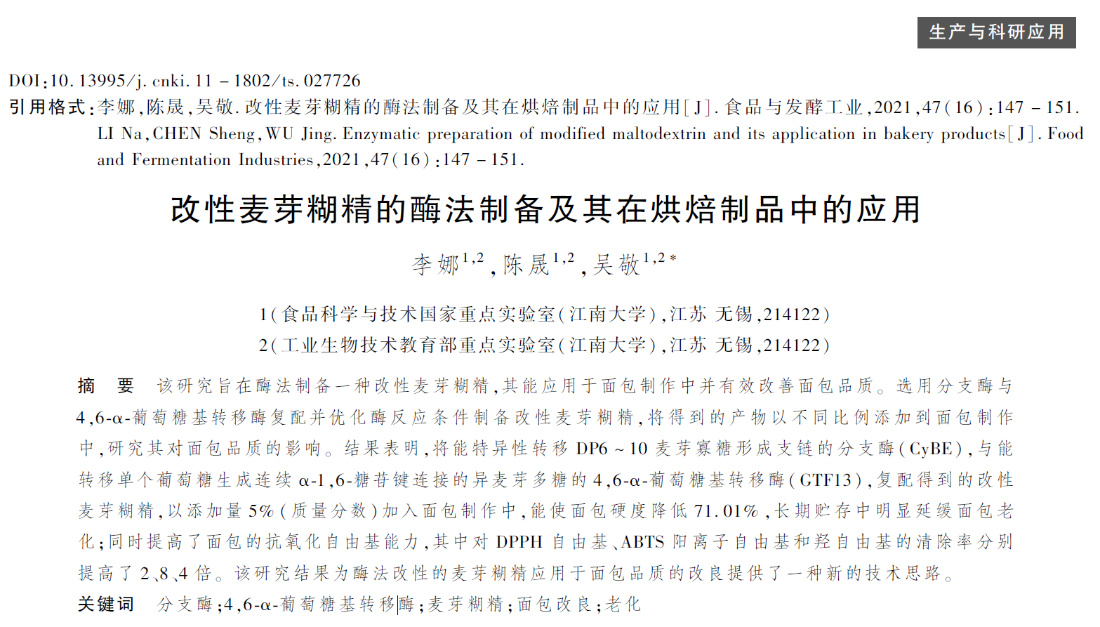 改性麥芽(ya)糊精的酶法制(zhi)備及其在(zai)烘焙制品中的(de)應(yīng)用