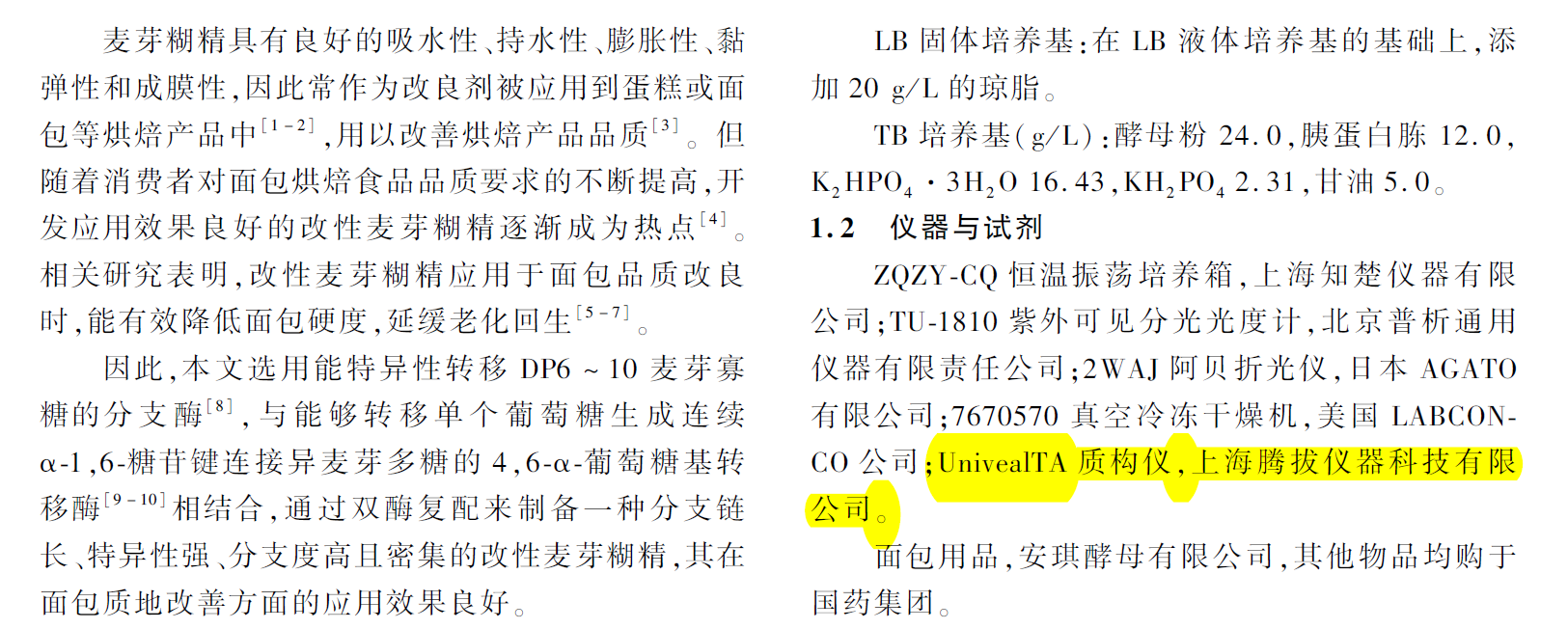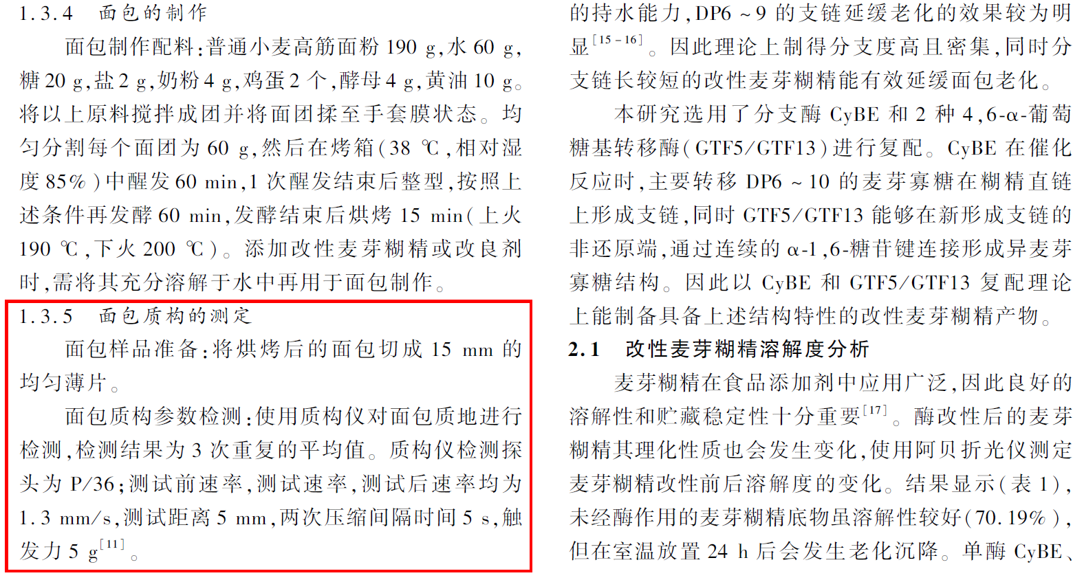Technical articles? 2021年,江南大學(xué)(xue)食品科學(xué)與技(ji)術(shù)國家重點(diǎn)實(shí)(shi)驗室(shi)研究(jiu)人員在國內(nèi)(nei)期刊《食品與(yu)發(fā)酵(jiao)工業(yè)(ye)》發(fā)表(biao)了題為“改(gai)性麥芽糊精(jing)的酶法制(zhi)備及(ji)其在烘焙(bei)制品(pin)中的應(yīng)用"的研(yan)究論文。在(zai)該論文中,研究(jiu)人員用(yong)上海騰拔Universal TA質(zhì)(zhi)構(gòu)儀測定(ding)面包的硬度(du)。