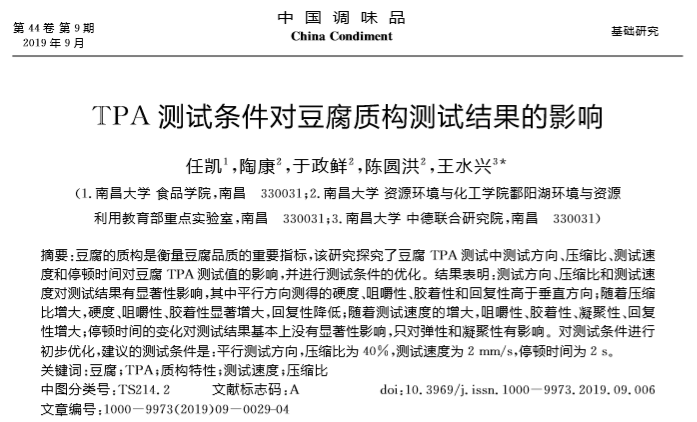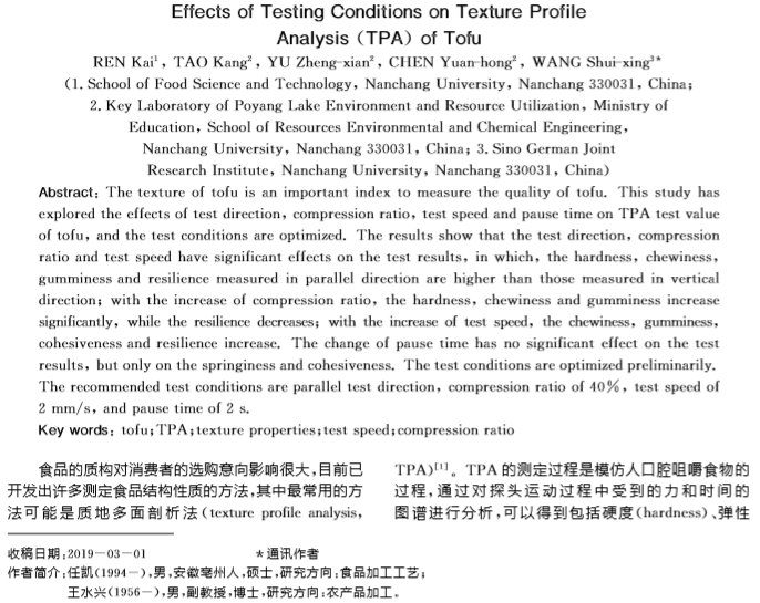 ? ? 2019年9月,《中(zhong)國(guó)調(diào)味(wei)品》期刊在線(xian)發(fā)表了(le)南昌大學(xué)題(ti)為“TPA測(cè)(ce)試條件對(duì)(dui)豆腐質(zhì)構(gòu)測(cè)試(shi)結(jié)果的影響(xiang)”的文章,在(zai)文章中(zhong),研究人員使用(yong)上海(hai)騰拔Universal TA質(zhì)(zhi)構(gòu)儀(yi)測(cè)定豆腐的硬(ying)度、彈性(xing)、回復(fù)性、咀(ju)嚼性等指標(biāo)。