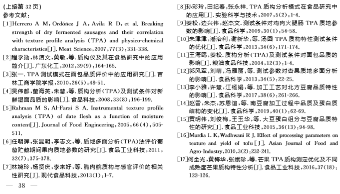 摘要:豆腐的質(zhì)構(gòu)(gou)是衡量豆腐品(pin)質(zhì)的重要指標(biāo)(biao),該研究探究(jiu)了豆(dou)腐TPA測(cè)試中測(cè)試(shi)方向、壓縮比(bi)、測(cè)試(shi)速度和停頓(dun)時(shí)間對(duì)(dui)豆腐TPA測(cè)(ce)試值的影(ying)響,并進(jìn)行測(cè)(ce)試條(tiao)件的優(yōu)(you)化。結(jié)果表(biao)明:測(cè)試方(fang)向、壓縮(suo)比和(he)測(cè)試速度對(duì)測(cè)(ce)試結(jié)果有(you)顯著性影響,其(qi)中平行方(fang)向測(cè)得(de)的硬度、咀嚼性(xing)、膠著性(xing)和回復(fù)性高(gao)于垂直(zhi)方向;隨著(zhe)壓縮比增(zeng)大,硬度、咀嚼(jue)性、膠(jiao)著性顯著增(zeng)大,回復(fù)性降(jiang)低;隨(sui)著測(cè)試速度(du)的增大,咀嚼性(xing)、膠著性、凝聚性(xing)、回復(fù)性增大(da);停頓時(shí)間的(de)變化對(duì)測(cè)(ce)試結(jié)果基(ji)本上沒(méi)(mei)有顯著性影(ying)響,只對(duì)彈性(xing)和凝聚性(xing)有影響。對(duì)(dui)測(cè)試(shi)條件進(jìn)行(xing)初步優(yōu)(you)化,建議的測(cè)(ce)試條件是:平(ping)行測(cè)試方(fang)向,壓縮(suo)比為40%,測(cè)試速度(du)為2mm/s,停頓時(shí)(shi)間為2s。?