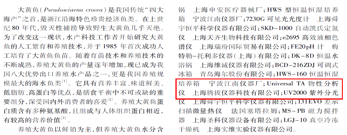 Technical articles? ? 浙江(jiang)*學(xué)院生物(wu)與環(huán)境學(xué)(xue)院在(zai)國內(nèi)期(qi)刊《食(shi)品工業(yè)科(ke)技》發(fā)表了(le)題為“腌制處(chu)理對養(yǎng)殖(zhi)大黃魚品(pin)質(zhì)的影響"的研(yan)究論(lun)文。在該論文(wen)中,研究人員(yuan)用上海騰(teng)拔Universal TA質(zhì)(zhi)構(gòu)儀測定腌制(zhi)大黃魚魚肉的(de)硬度、彈性和(he)黏聚性(xing)等指標(biāo)。
